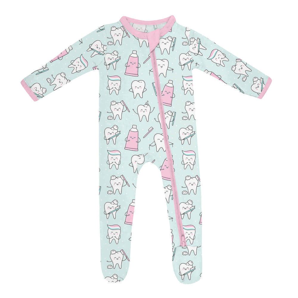 Crafted from Bamboo, this romper delivers a soft, gentle feel against delicate skin with a quirky dental pattern. The dual zipper and fold-over cuffs provide easy diaper changes and added comfort for your little one.